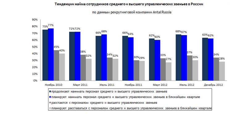 Несмотря на общемировую тенденцию в России уровень спроса на высококвалифицированных специалистов продолжает оставаться стабильно высоким. Приблизительно 63% компаний искали менеджеров среднего и высшего звена в декабре 2012 года, и 62% собираются нанимать их в течение I квартала 2013 года. Кроме того, о стабильности рынка труда свидетельствует заметное снижение темпов сокращения персонала. Если в конце 2012 года 34% компаний сообщали о том, что они сокращают сотрудников, то в I квартале 2013 года только 28% заявляют о своих намерениях уменьшить штат работников.
