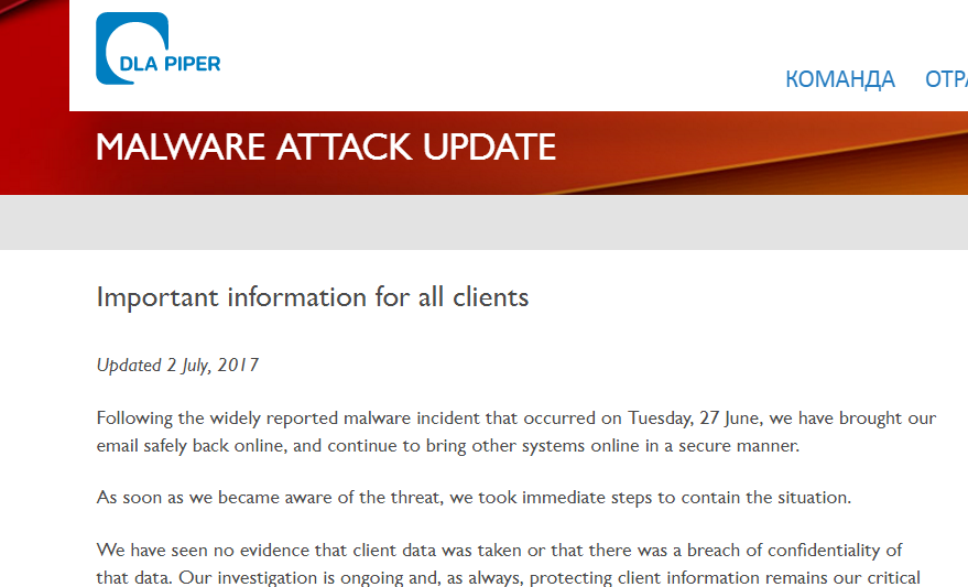 Международная юридическая компания DLA Piper 2 июля разместила у себя на сайте информацию о том, что ее ИТ-системы были атакованы. В результате сотрудники компании не могли отвечать за электронную почту с период с 27 июня по 1 июля. Читать текст заявления полностью: https://www.dlapiper.com/ru/russia/focus/dla-piper-malware-attack-update/