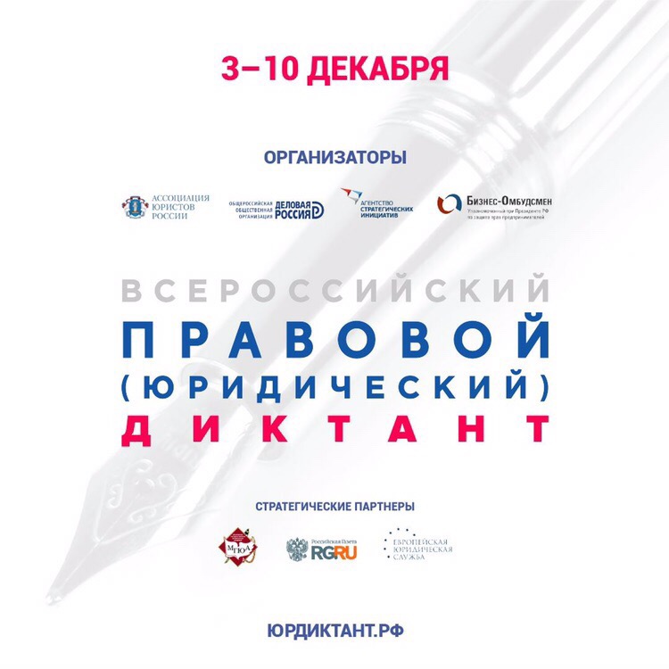 Организаторами диктанта выступают Ассоциация юристов России, «Деловая Россия», Московский государственный юридический университет имени О.Е. Кутафина (МГЮА), уполномоченный при Президенте Российской Федерации по защите прав предпринимателей и Агентство стратегических инициатив.